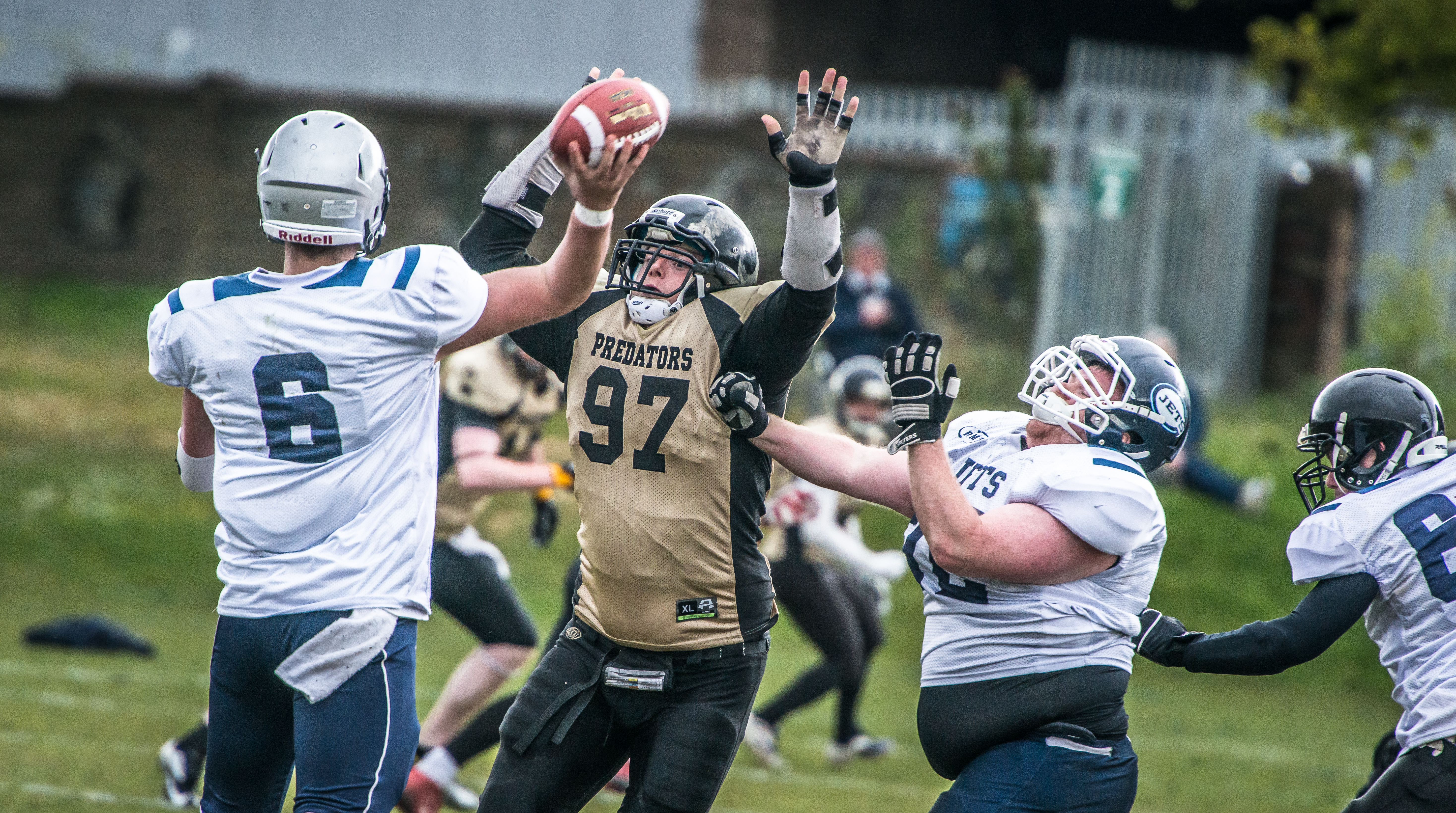CLICK FOR HIGH RESOLUTION VERSION - Sheffield Predators Defence .. Stephen 'Tickle' Connolly (#97) blocks the Coventry Jets QB, 1st May 2016. Photo: Andy Hiseman. |