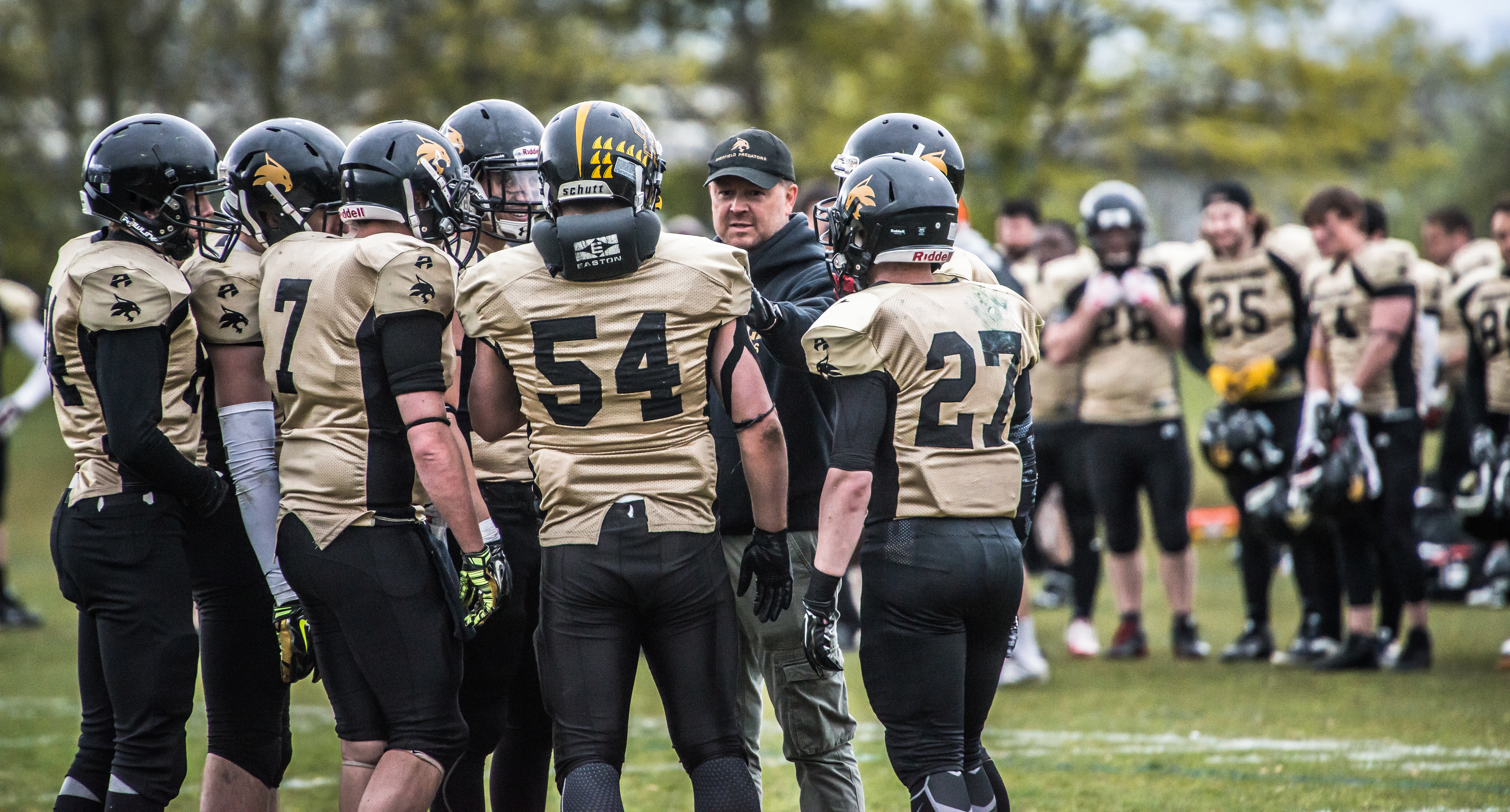 CLICK FOR HIGH RESOLUTION VERSION - Sheffield Predators coach Richard 'Grizz' Batty gives a team talk on the pitch, in the fourth and final quarter of the BAFANL Northern Premier Division match against Coventry Jets, on Sunday 1st May 2016. Photo: Andy Hiseman. |