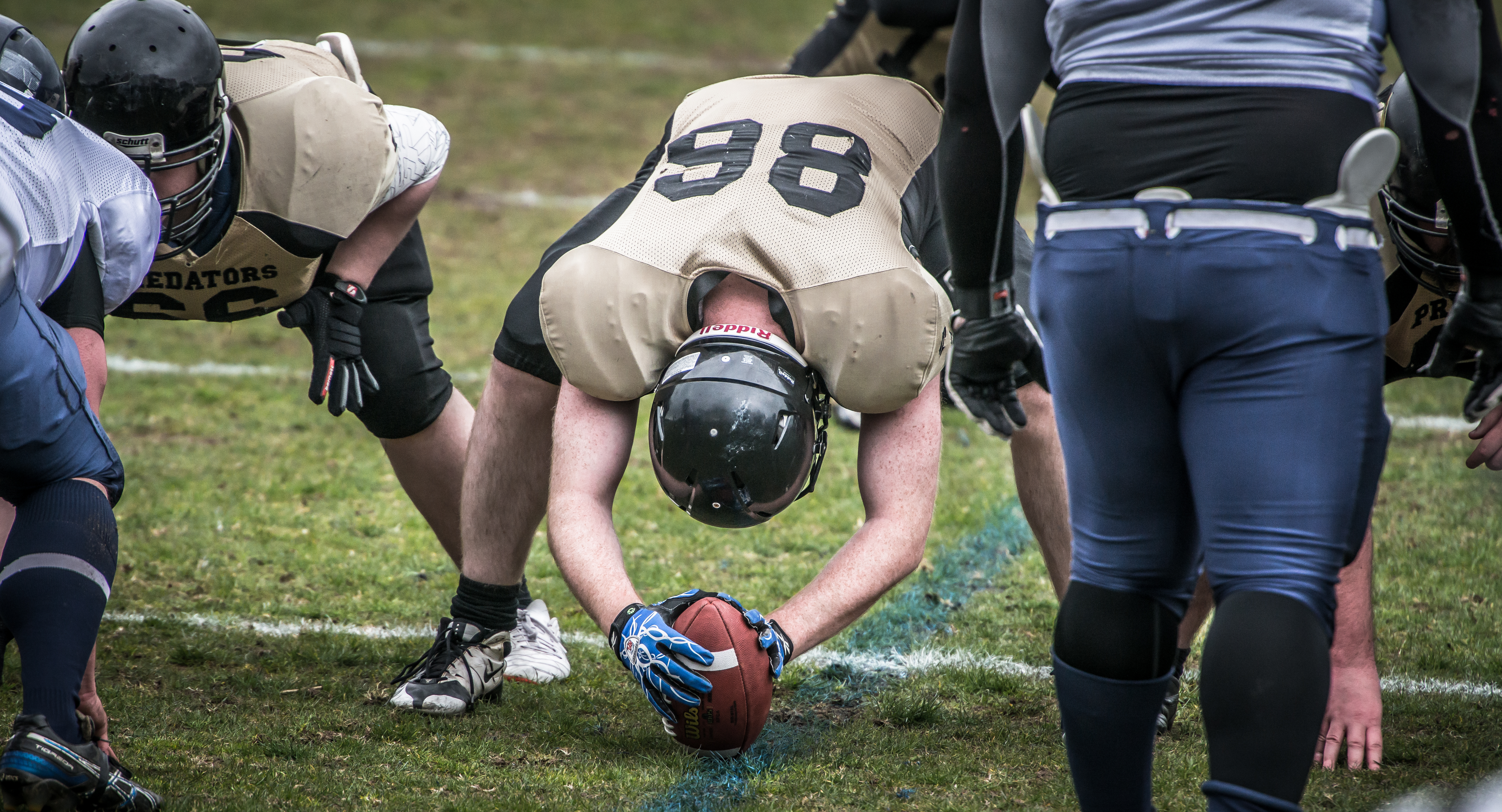 CLICK FOR HIGH RESOLUTION VERSION - Sheffield Predators footballer John Gilmartin (#86) at the snap, 1st May 2016. Photo: Andy Hiseman. |