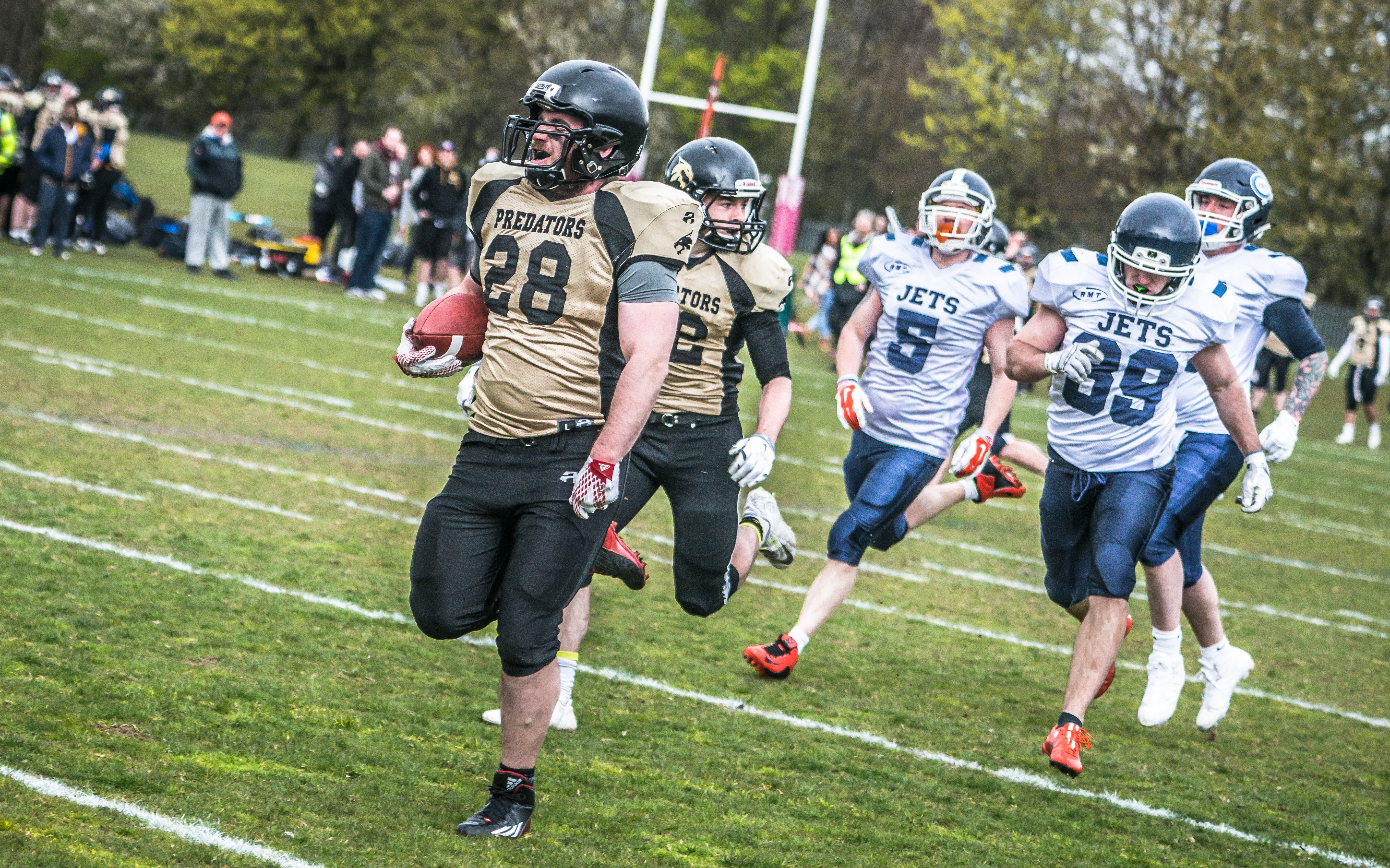 CLICK FOR HIGH RESOLUTION VERSION - Sheffield Predators footballer Harry O'Neill (#28) scores a touchdown against Coventry Jets, 1st May 2016. Photo: Andy Hiseman. |